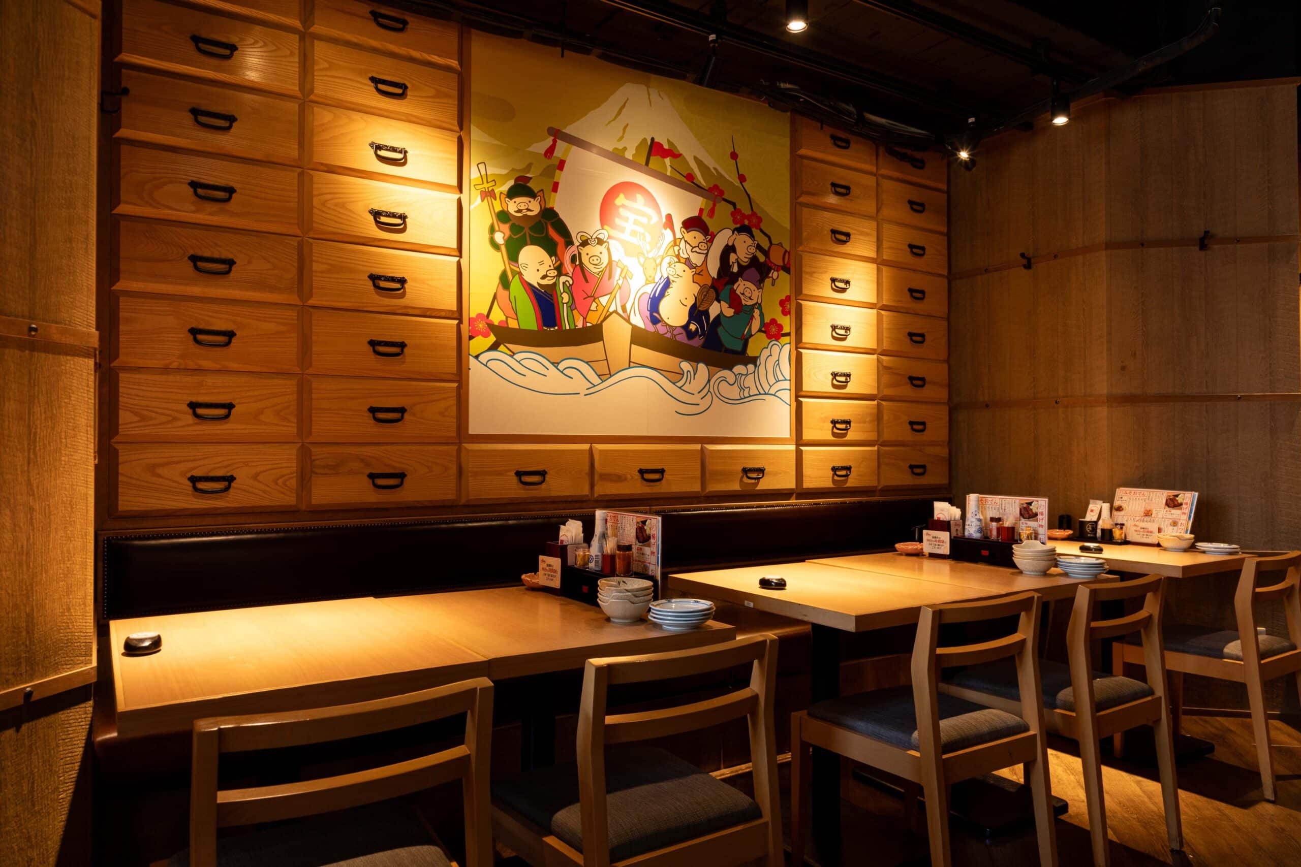 味噌樽をイメージした内観は、木のぬくもりを感じるレトロな雰囲気です。美味しい料理を食べながらお寛ぎください。